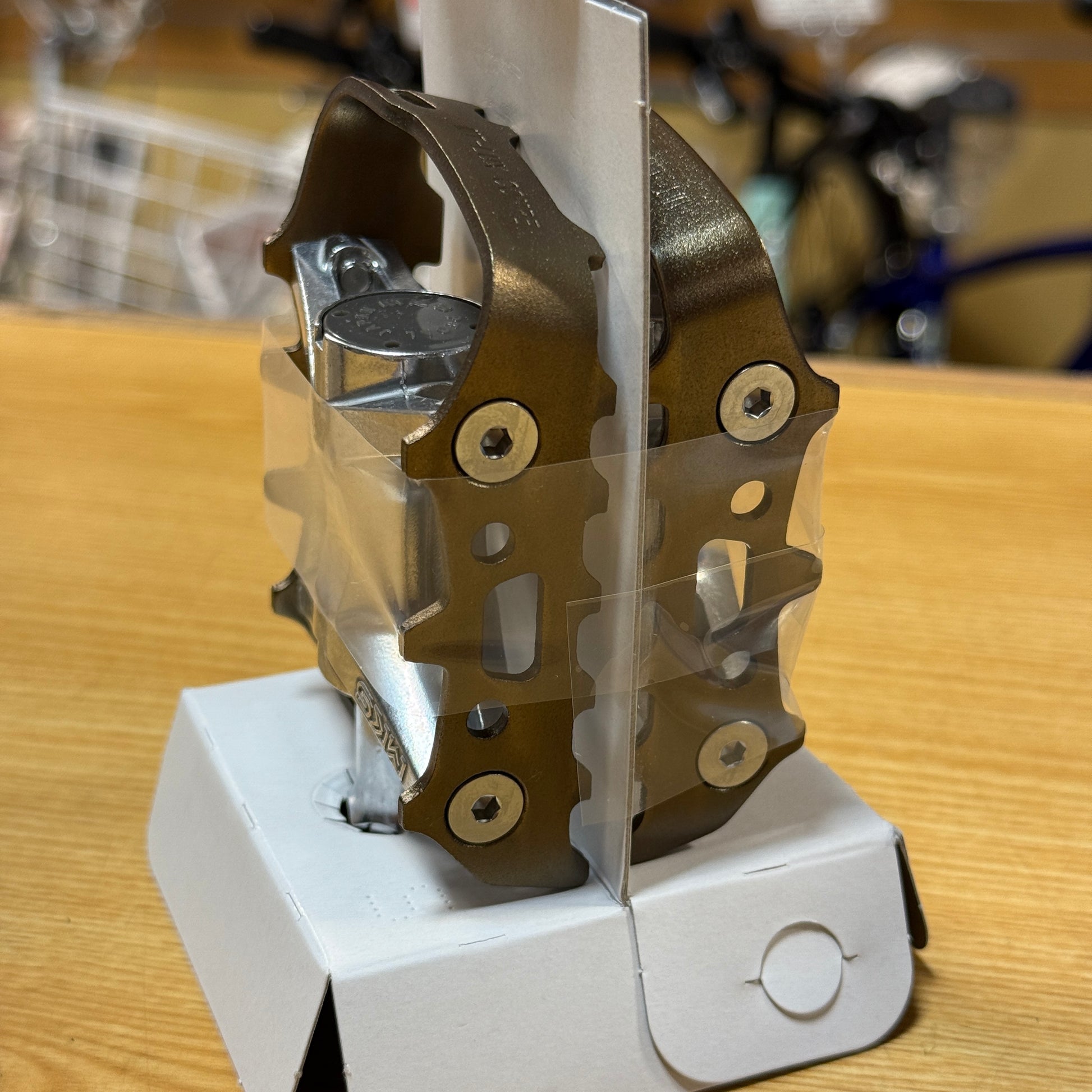 - 片面踏みである為ペア重量は310gと軽く、コーナーリング時のロードクリアランスを確保しています。
