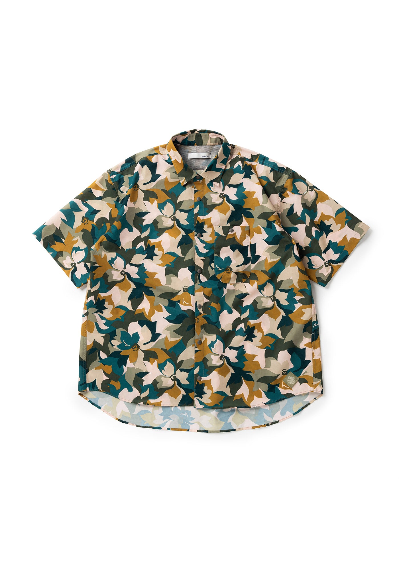 見た目はメッシュ組織に見えない程細かい穴の組織のポリエステル生地の表面にプリントを施した素材を使用し、速乾性と通気性を確保。カラーにより無地と総柄をお選び頂けます。胸のサングラス収納ポケットが特徴。